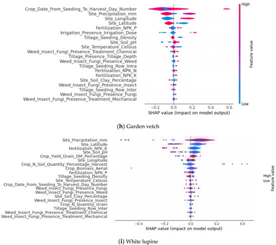 The garden vetch yield (Figure 4h) graph also exhibits a bidirectional effect on yield, similar to peanuts, indicating that garden vetch yield may interact more significantly with other characteristics. Furthermore, the yield of garden vetch is negatively correlated with both precipitation in millimeters and site longitude. Garden vetch, known for its strong adaptability, is a relatively drought-tolerant plant that can thrive under various soil types and water conditions, including drought and poor soil. Garden vetch is also shade-tolerant and exhibits a certain degree of tolerance to low-light conditions, enabling successful growth in some semi-shady areas.