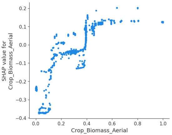 In the summary graph, we discern the relationship between the top 20 eigenvalues, which exert the most substantial impact on yield, and the predicted outcomes. However, to fully grasp the essence of this relationship, it is necessary to consult the SHAP dependency plot. SHAP feature dependencies provide a clear-cut method for globally interpreting the graphs. It becomes clear from the SHAP summary graph that a higher Biomass_Aerial positively sways the yield of various crops, including Garden_pea, Chickpea, Cowpea, Lentil, Pigeonpea, Peanut, and Narrowleaf_lupine. This suggests that as plants produce more aerial biomass during their growth, their yields correspondingly escalate. Aerial biomass includes the biomass of the stems, leaves, and fruits of plants. The increase in aerial biomass signifies that plants can engage in more photosynthesis, synthesizing and accumulating additional nutrients and organic substances, thereby fostering higher yields. To exemplify this, we consider lentil. By selecting the feature Crop_Biomass_Aerial, which has the most pronounced impact on the yield of lentil, we can plot a point for each data instance. The x-axis represents the feature value, while the y-axis represents the corresponding Shapley value. Figure 5 exhibits the SHAP feature dependence of Crop_Biomass_Aerial, illustrating that as the value of Crop_Biomass_Aerial ascends, the probability of surpassing the global average yield also rises.