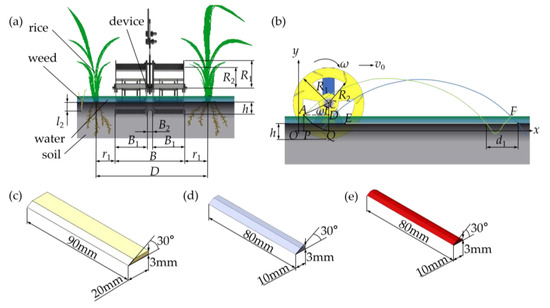 Schematic diagram of the device working parameters and structural parameters. (a) Paddy field inter-row weed control environment; (b) Weed control wheel movement trajectory; (c) Dynamic blade dimensions; (d) Pre-fixed blade dimensions; (e) Rear-fixed blade dimensions.