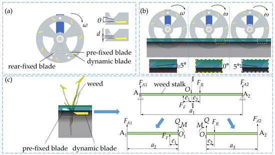 Undetermined structural parameters of the weed control wheel and theoretical analysis of the weed cutting process. (a) Gap and cutting angle of the dynamic–static blade; (b) Dynamic blade install angle; (c) Theoretical analysis of weed cutting by the dynamic–static blade.