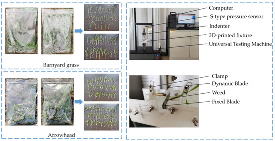The experimental materials and required equipment are shown in Figure 5. The equipment includes: dynamic blades and fixed blades (made of Q235 steel, 3 mm thick, with a blade angle of 30°); A 3D-printed fixture was fabricated to secure the blades and weeds; A YHS-216W-500N universal testing machine (Shanghai Yiheng Instrument Technology Co., Ltd., Shanghai, China) and a U10A S-type pressure sensor (Shanghai Jiuzhi Sensor Co., Ltd., Shanghai, China) were used; In addition, vernier calipers (accuracy 0.02 mm) and a steel ruler (accuracy 0.5 mm) were used to measure the geometric parameters of the paddy field weeds.