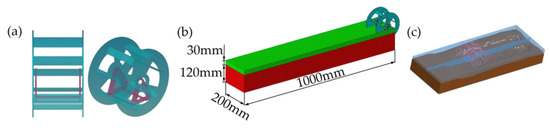 The structured arbitrary lagrangian-eulerian (S-ALE) algorithm was used for simulation analysis. The mesh distribution information in three directions was specified using ALE_STRUCTURED_MESH_CONTROL_POINTS and ALE_STRUCTURED_MESH keywords to generate the fluid domain. The dimensions of the water layer model (length × width × height) were set to 1000 mm × 200 mm × 30 mm, and the dimensions of the soil layer model (length × width × height) were set to 1000 mm × 200 mm × 120 mm to automatically partition the water–soil mesh. The model is shown in Figure 6a,b.