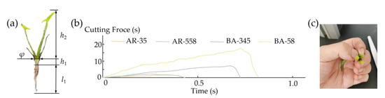 Different parts of plant stems produce different cutting forces [44]. Therefore, before the experiment, the stems were marked with a marker pen at a distance h1 from their base to ensure that the blades cut at the marked location, reducing experimental errors due to different cutting locations. The weed was cut at a controlled rate of 8.3 × 10−3 m/s using an S-type pressure sensor, which recorded the force–time curve and transmitted it to the computer.