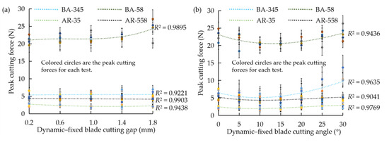 To obtain the reasonable range of the cutting gap and cutting angle between the dynamic blade and the fixed blade in the simulation tests in Section 2.4, two single-factor tests on the mechanical properties of weed cutting were carried out. The experimental indicators for both single-factor tests were the peak cutting force of the weeds. In the first single-factor experiment, the dynamic—static blade cutting angle was held constant at 15°, while the dynamic–static blade cutting gap was set at 5 levels: 0.2 mm, 0.6 mm, 1 mm, 1.4 mm, and 1.8 mm. In the second single-factor experiment, the dynamic–static blade cutting gap was kept constant at 1 mm, and the dynamic–static blade cutting angle was varied across 7 levels: 0°, 5°, 10°, 15°, 20°, 25° and 30°. Each level was repeated five times. Initially, a polynomial regression analysis was performed on the experimental results, followed by a one-way ANOVA using SPSS 26 (International Business Machines Corporation, NYC, NY, USA) software, considering a p-value < 0.05 as statistically significant. In order to ensure the validity of the study and reduce the interference of selection bias and confounding factors, we implemented a simple randomized layout. That is, the sequence of tests is determined by a table of random numbers generated by a computer.