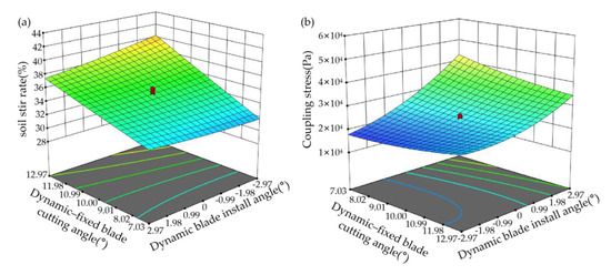 To determine the optimal combination of structural parameters for the dynamic–static blade cutting gap, the dynamic–static blade cutting angle, and the dynamic blade install angle that makes the performance of the weeding device optimal, a three-factor, five-level simulation experiment was conducted using the central composite design principle in Design-Expert 8.0.6 software. Building on the single-factor experiments described earlier, and in conjunction with the theoretical analysis provided, the experimental factors considered were the parameters d, θ, and α of the device. The evaluation criteria were the soil stir rate y1 and coupling stress y2. The response surface method was used to analyze the experiment results, and the corresponding mathematical model was established. The F-test was performed at a p = 0.05 level. The levels of experimental factors were encoded as shown in Table 2. In order to reduce the errors caused by non-random arrangement, strict randomized layout was implemented. The sequence of tests was determined by means of a computer generating random numbers.
