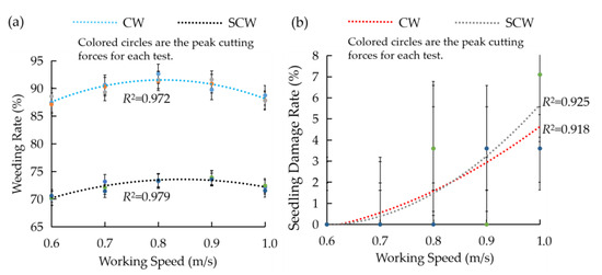 Field test results. (a) The trend of weeding rate variation with the speed for two types of weeding wheels; (b) The trend of seedling damage rate variation with the speed for two types of weeding wheels.