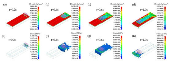 Density vs. coupling stress cloud maps at different time intervals. (a–d) Density cloud maps at different time intervals; (e–h) Coupling stress cloud maps at different time intervals.
