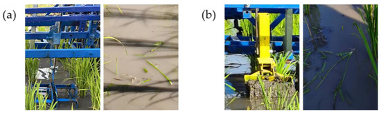 The structural parameters of the combined paddy field inter-row weeding wheel (CW) were rounded off based on the optimized values for ease of processing and assembly: d was set at 1.4 mm, θ at 11.0°, and α at −3.5°. The key specifications of a rat cage bar-type paddy field inter-row weeding wheel (SCW) include a working width of 200 mm and 10 grid bars. The CW and SCW were mounted on the remote-controlled chassis for paddy fields (power 3.6 kW, wheel track width 1.2 m, wheelbase 0.8 m) using bolts. The field experiment setup is shown in Figure 7a.