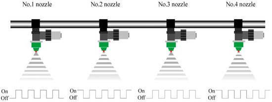 PWM technology controls the nozzle’s flow rate by pulsing an electronically actuated solenoid valve directly upstream of the nozzle. The flow is changed by controlling the relative proportion of time each solenoid valve is open (duty cycle). The traditional PWM variable spray adopts the same-phase drive mode; specifically, all sprinklers open and close at the same time (the No. 1, No. 2, No. 3, and No. 4 nozzles open and close at the same time); this can cause serious fluctuations in the pipeline pressure, poor consistency of atomized droplet size, and inhomogeneity deposition in the direction of spraying. In this study, a variable spraying system was designed with a staggered-phase drive, and a schematic diagram of the working principle is shown in Figure 1; specifically, nozzles No. 1 and No. 3 are closed first and then opened, while nozzles No. 2 and No. 4 are opened first and then closed.
