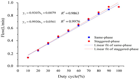 As shown in Figure 3, the flow rate of the nozzle gradually increased with an increasing PWM duty cycle during the drive modes of the same and staggered phases. The flow adjustment multiple was 7.01 under the same-phase drive mode. Further analysis showed that the flow rate had a good linear relationship with the duty cycle and that the value was 0.9863. The flow rate was the lowest when the duty cycle was 10% under the staggered-phase drive, which was 0.132 L/min, and when the duty cycle reached 90%, the flow growth trend slowed to 0.936 L/min; this was basically the same as the flow rate when the duty cycle was 100%. The calculations showed that the flow adjustment multiple was 7.10 under the staggered-phase drive mode, the flow rate and duty cycle had a good linear relationship, and the value was 0.9976. The linear interval between the nozzle’s flow and duty cycle was 10~90%. The difference between the flow adjustment times of the same phase and the staggered phase was minimal, which confirmed that the PWM spray system driven by the staggered phase had minimal influence on the variable spraying of the nozzle, and this aspect can be studied more thoroughly in the future.