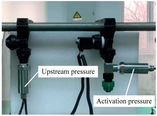The test was carried out using the test platform built in Section 2.1.1, as shown in Figure 4. A pressure sensor was installed 20 cm in front of the No. 1 nozzle of the test nozzle for testing the upstream pressure valve of the nozzle. A pressure sensor was installed below the No. 1 nozzle, and the activation pressure of the nozzle was measured. To ensure the safety of the spraying system’s pipeline during the test process, a return pipeline was arranged, and the system had a certain amount of return flow during the spraying process through the setting of the reflux valve.