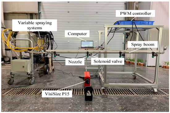 To test the atomization characteristics of the staggered-phase-driven PWM variable spray system compared with those of the conventional same-phase PWM system, an atomization test was carried out in the spraying laboratory of the National Precision Agriculture Research Base at a temperature of 20.3 °C and humidity of 39.6%. As shown in Figure 5, the PWM variable spray system’s atomization test platform was composed of a variable spray system, a spray boom, nozzles and solenoid valves, a controller, and a computer, as described in Section 2.1. The spray system supplied pesticide to the spray boom; the spray boom was fixed on the bench, and 4 nozzles spaced 50 cm apart were installed on it. An Oxford laser VisiSize P15 laser analyzer (British, OXFORD LASERS Ltd., Didcot, UK) was placed 50 cm directly below the No. 2 nozzle.