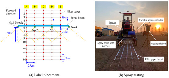 To test the degree of uniformity of the deposition of the staggered-phase-driven PWM variable spray system compared with that of the conventional same-phase system, a deposition test was carried out at the National Precision Agriculture Research Base in Xiaotangshan Town, Changping District, Beijing, China, Base, at a temperature of 29.5 °C, a humidity of 39.4%, and a southeasterly wind speed of 0.75 m/s. As shown in Figure 6, the test was completed with a 3WSH-500 self-propelled boom sprayer (Shandong Yongjia Power Co., Ltd., Shandong, China). The PWM variable spraying control system designed in Section 2.1 was installed, the spray boom was installed with 4 nozzles, and each nozzle was adjacent to 50 cm. The test droplets were collected with filter paper with a diameter of 3.5 cm. The nozzle was placed 50 cm above the filter paper, and the arrangement of the filter paper is shown in Figure 6. The travel speed was set 2 m/s to ensure a travel distance of 40 cm for each control cycle (200 ms) with at least 6 filter papers to display changes in the uniformity of droplet coverage; a distance of 7 cm was set for each filter paper. The spacing between the five columns (A–E) of filter paper was 25 cm, 90 filter papers were evenly arranged in each column, nozzles No. 2 and No. 3 were placed directly above columns B and D, and the total test length was 6.23 m.