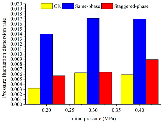 Through a real-time collection of the pressure values of the spray system with the same-phase and staggered-phase PWM variables under different initial pressures and calculations according to Equations (2) and (4), the dispersion rate of the pressure fluctuations in the three groups of tests is shown in Figure 7. The dispersion rate of the pressure fluctuations in the spray system under the same-phase-driven mode was 0.017134; this value was 171.84% greater than that of the control group. Additionally, the dispersion rate of the pressure fluctuations in the spray system was 0.006377; this value was 1.18% greater than that of the control group. These results showed that, in this case, the pressure fluctuations in the system were basically eliminated. At this time, the dispersion rate of the dislocation pressure fluctuation was reduced by 62.78% compared with that of the same phase.