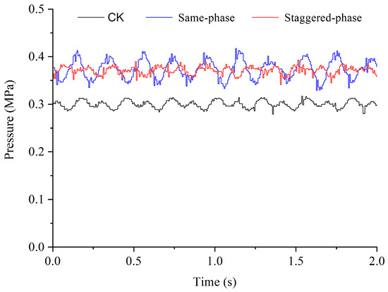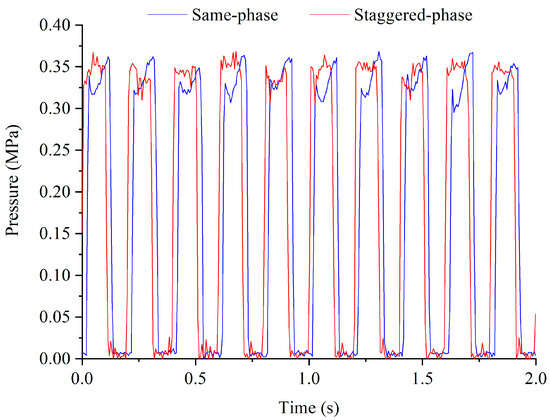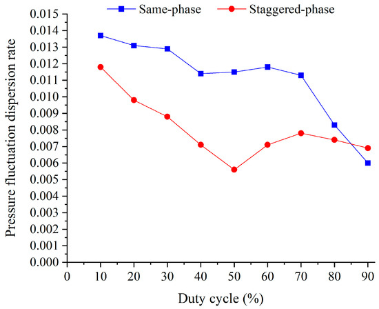 In the same 2.1.3 test process, the reflux ratio of the system was 40%. The test was performed in two groups as follows: one group was in the same phase, and the other was in the staggered-phase comparison test. The initial pressure of the system was set to 0.3 MPa, the PWM frequency was set to 5 Hz, and the duty cycles were set to 10%, 20%, 30%, …, 90%. The acquisition time was 10 s, and the pressure monitoring time interval was set to 0.006 s. Each test was repeated three times, the upstream pressure of the nozzle under the corresponding test conditions was obtained, and the pressure fluctuation’s discrete rates from the two groups of comparative tests were calculated according to Equation (4).