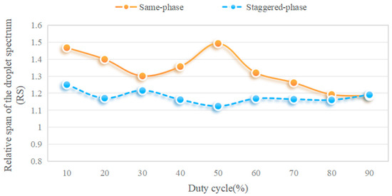As shown in Table 4, minimal differences were observed between the PWM variable spray droplets of . Compared to the atomization test results of the PWM variable spray system of the two driving modes, as shown in Table 4, it suggested that the droplet particle size increased with the increase in the duty cycle in the PWM variable spray system. Both and of the staggered-phase system were slightly larger than those of the same-phase system, while showed an opposite trend. This resulted in a large difference in the RSs between the two systems, which is an important index for evaluating droplet particle size uniformity. As shown in Figure 13, the RSs of the same-phase and staggered-phase variable spray systems were calculated based on Formula (5) under different duty cycles. The test results showed that the RS value of the variable spray system driven by the same-phase method fluctuated greatly under different duty cycles. In the range of 10–50%, the RS value first decreased and then obviously increased. When the duty cycle was 30%, the minimum RS value was 1.30, and when the duty cycle was 50%, the maximum RS value reached 1.49. When the duty cycle was greater than 50%, the RS value showed a gradually decreasing trend. The RS value of the staggered-phase variable spray system with a different duty cycle changed more smoothly than that of the same-phase system. The minimum RS value was 1.12 at a 50% duty cycle, which was 24.83% lower than that of the same-phase system. These results potentially occurred because the activation pressure of the nozzle could reach the threshold faster than it could in the same phase; thus, this caused relatively smaller particle sizes, more uniform and consistent particle sizes of the atomized droplets, and a decreased RS.