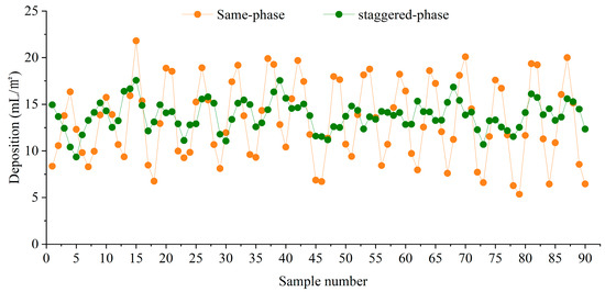 The deposition amount on each filter paper was calculated according to Formula (7), and the average was determined. According to Formula (8), the of the PWM variable spray system driven by the staggered phase was 12.88%, an increase of 2.79% compared with 10.09% in the same phase. This difference was potentially caused by changes in the wind speed and direction during the experiment, which resulted in slight changes in the uniformity of sedimentation in the direction of the spray boom in both experiments; however, the values did not exceed 15%. Therefore, our system met the national standard GB/T24677 1-2009 [51] Technical Conditions for Spray Bar Spray, which states this value should be lower than 20%.