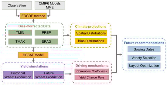 This paper seeks to integrate agricultural meteorological observations with CMIP6 data to assess the impacts of climate change on winter wheat yields in the 3H Plain, thereby influencing regional climate suitability divisions. Utilizing the DSSAT CERES-Wheat model and six CMIP6 models, this study aims to predict future winter wheat yields in the 3H Plain for the mid- and late 21st century under various scenarios, the flow chart of which is depicted in Figure 1. The specific objectives of this study are to (1) refine the climate projections generated by CMIP6 models to enhance their accuracy and identify the variability in climatic variables; (2) to assess the production of winter wheat in the 3H Plain for the mid- and late 21st century across varied scenarios; (3) to uncover the climatic factors influencing future changes in winter wheat yields; and (4) to offer guidance on the optimal sowing dates, the selection of wheat varieties, and strategic planning for the cultivation of winter wheat.