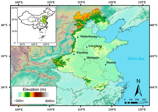 The 3H Plain (112.3–120.7° E, 31.1–40.3° N), delimited by the Yellow Sea to the east and covering an area of approximately 350,500 km2 (Figure 2), exhibits an extratropical monsoon climate. Annual precipitation varies from 430 mm to 1390 mm, with mean temperatures ranging between 8 °C and 15 °C [50]. Notably, over 70% of the annual precipitation occurs during the summer season (June–September) [8], reflecting the region’s uneven precipitation distribution. The 3H Plain, with its 140,000 km2 of arable land [51], is a key grain-producing area in China, contributing over 70% to the country’s winter wheat yields. Winter wheat is typically sown in October and harvested in June of the following year.
