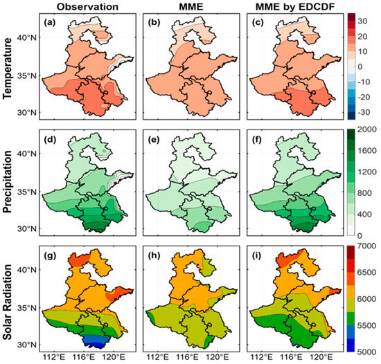 Spatial distributions of (a–c) temperature (°C), (d–f) precipitation (mm), and (g–i) solar radiation (MJ/m2) over the 3H Plain from 1950 to 2014. The data include observations, the ensemble of raw CMIP6-simulated records, and the bias-corrected results using EDCDF.