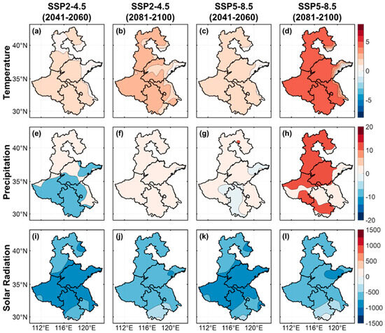 Figure 5 also depicts the spatial patterns of solar radiation across the 3H Plain during the mid- and late 21st century, as simulated under the SSP2-4.5 and SSP5-8.5 scenarios. Solar radiation projections indicate reductions across the 3H Plain in both the mid- and late 21st century under both scenarios (Figure 5i–l), with a smaller decline in the late 21st century, primarily in the central and southern regions of the 3H Plain (Figure 5i–k).