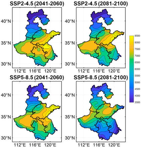 Using bias-corrected CMIP6 data under SSP2-4.5 and SSP5-8.5 scenarios, future winter wheat yields were simulated (Figure 6). The SSP2-4.5 scenario predicted broadly high yields in the central 3H Plain for both the 2041–2060 and 2081–2100 periods. Under the SSP5-8.5 scenario, yields in the middle of the 3H Plain were high during the mid-21st century (2041–2060), similar to the SSP2-4.5 scenario, but showed a slight decrease in magnitude and lower yields in the southern 3H Plain during the late 21st century (2081–2100).