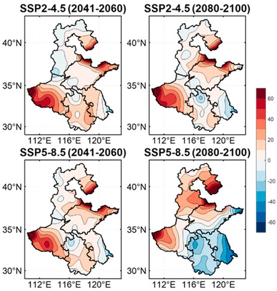 Regarding precipitation, changes during the 2041–2060 period under both scenarios exhibited similar spatial patterns, with decreases observed over the southern and northeast 3H Plain and increases in the northwest (Figure 5e–g). The late 21st century under the SSP5-8.5 scenario showed a slight increase in precipitation, with a more pronounced increase across the 3H Plain from the mid- to late 21st century under the same scenario (Figure 5f–h). These findings aligned with previous research [29,58].