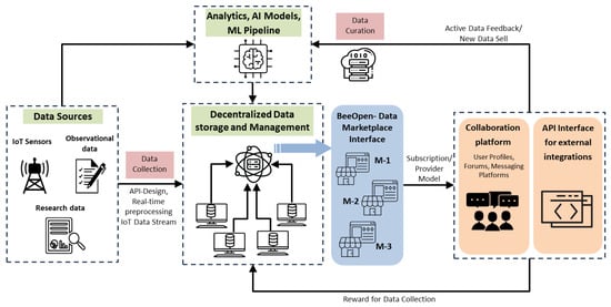 Therefore, we suggest developing an open and collaborative framework to manage apiculture data sets, as demonstrated in Figure 1. The ecosystem’s stakeholders consist of individuals and entities engaged in the utilization, provision, curation, and development of data, as well as creators of AI/ML models. A decentralized autonomous organization (DAO) governance model for the platform enables decision-making processes, allowing the stakeholders to also vote on critical issues. This helps create transparent policies for usage, contributions and rewards governed by community consensus. Data providers procure data and transmit them to the established data repositories. It should be noted that users have the capability to serve as data providers through the utilization of applications that utilize an artificial intelligence and ML model, simultaneously augmenting the existing data pool with newly added information. Data curators are responsible for the systematic handling of incoming data, including the elimination of substandard input and the incorporation of relevant metadata and labels as appropriate. Data curators conduct quality assurance assessments on data provided by fellow curators. Data curators validate the quality and authenticity of data.
