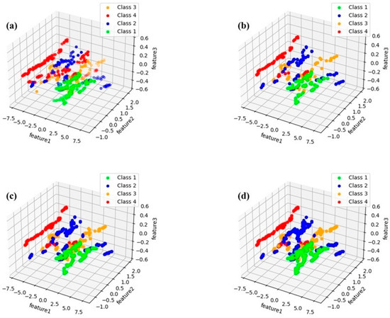 Spatial distribution maps of original data and synthetic samples for different values of K based on PCA. (a) Original data. (b) Synthetic data for K = 1. (c) Synthetic data for K = 2. (d) Synthetic data for K = 3. The legend Class 1–4 represents the four categories in this study.