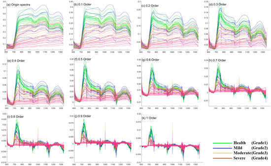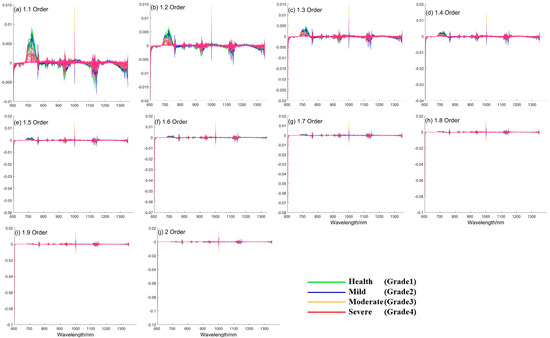 To investigate the improvement in FOD on peanut southern blight spectra, we applied fractional-order differences to the original spectra with a step size of 0.1, obtaining spectral curves for different severities as shown in Figure 4a–k The original spectra are smooth, with two weak absorption features near 970 nm and 1200 nm influenced by internal leaf structures. Absorption valleys and reflection peaks increase with the FOD order, and at FOD = 0.5, reflectance becomes negative, with significant fluctuations in many curves. As shown in Figure 5a–j, after FOD = 1.1, this fluctuation trend gradually slows down, and after FOD = 1.4, the dimensional differences between various spectral curves gradually decrease, showing signs of overlap. At the same time, the spiky trend of the spectral curves deepens, and the entire spectrum becomes chaotic.