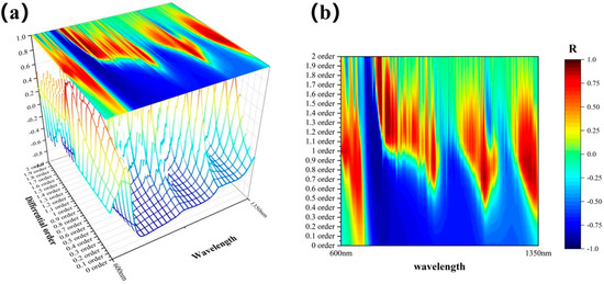 As shown in Figure 4, a fractional-order differential transformation with a step size of 0.1 is applied to the original spectra, and the overall spectral shape exhibits a significant changing trend. Before FOD = 0.9, with the increase in order, the spectral differences are magnified, leading to many distinctive absorption valleys and reflection peaks. However, at higher orders, this unique phenomenon is masked, and the separability of various spectral curves gradually decreases. Zhang suggested that this phenomenon could be explained using the G-L mathematical theory. When the sampling step is smaller than the width of the peaks and valleys, spectral differences are magnified. The noise phenomenon arises because the calculation of FOD introduces high-frequency noise when dealing with short-interval peaks and valleys in the spectrum [38]. This phenomenon can also be observed in Figure 6. Additionally, we observed that while FOD enhances the correlation between the spectrum and peanut southern blight, it also leads to certain originally positive correlations in specific bands becoming negative, and vice versa. The original bands exhibit a significant negative correlation near the red edge, and with the increase in FOD, it gradually turns positive around FOD = 1.1. This conclusion has been supported by various studies; Jiang et al. suggested that it is due to the capture of long-term memory and non-local features in the data by FOD [37], while Kilbas et al. proposed that it might be caused by nonlinear relationships between variables [69].