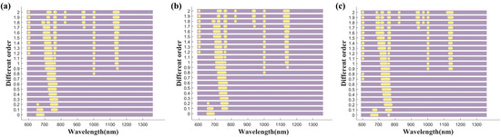 To assess whether FOD can improve the correlation between disease severity and spectral reflectance, we compared the correlation information between FOD spectra and disease severity at different orders with a step size of 0.1 (Figure 6). For the original spectra, at FOD = 0, a significant negative correlation was observed in the red edge, with the maximum correlation at 756 nm (R = −0.83). As the FOD order increased, the correlation coefficient changed. For instance, at FOD = 1.1, the correlation gradually became positive around 780 nm. Moreover, the spectra correlations based on FOD were generally better than the original spectra, indicating that using FOD could enhance the spectral details and increase the separability of disease severity.