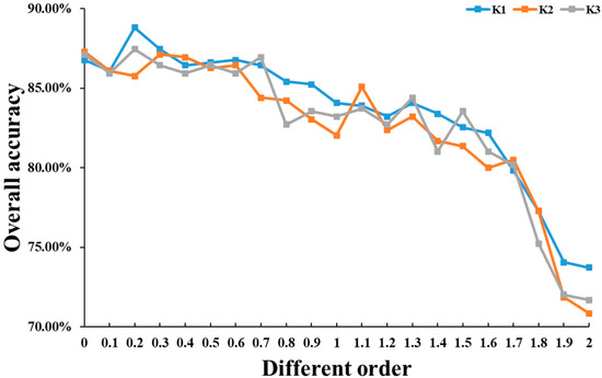 In order to investigate the impact of different FODs on the detection of peanut southern blight and determine the optimal K neighbors for the SMOTE algorithm, we applied the 1D-CNN model to spectra processed with 20 different FOD orders, as shown in Table 2. When K = 1 and FOD = 0.2, the overall accuracy (OA) was 88.81%, and the Kappa coefficient was 0.85, which was better than the performance with the original spectra (FOD = 0, OA = 86.78%, Kappa = 0.82). Furthermore, we analyzed the variation of overall accuracy with different values of K for the entire range of FOD, as shown in Figure 8. We observed a decreasing trend in overall accuracy with increasing K values, and the overall accuracy was generally higher when K = 1 compared to other values.