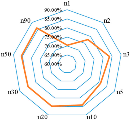 On this basis, to determine the optimal values for K (number of nearest neighbors) and the synthesis multiplier n, we tested the data results for n = 10 with K1, K2, and K3 separately. As shown in Figure 8, we found that overall FOD differential accuracy is better when using K1 compared to the other values. Using a smaller k can generate a representative dataset for our data, and we agree with Ebrahimy et al., that further experiments are needed to evaluate other crops [61]. In addition, in recent years, the multiplier n for synthetic data has also been widely discussed [62]. In this study, we attempted to analyze the impact of different synthetic multipliers on the model to determine the optimal value for n. We used SVM, the least effective model among the three, for this analysis, and the results are shown in Figure 9. As the synthesis data multiplier n increases, the overall accuracy stabilizes after n = 10. As mentioned by Sun, blindly continuing to increase the synthesis multipliers n and k can undoubtedly increase computational load, which is often undesirable while maintaining optimal accuracy [20].