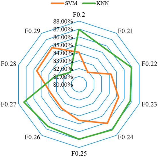 In order to further investigate the impact of FOD on the monitoring of the severity of peanut southern blight, we used 1D-CNN, SVM, and KNN models for evaluation. As shown in Table 2 and Table 4, with the increase in FOD order, the overall accuracy shows an upward and then downward trend. FOD = 0.2 is the optimal order, and all three models have high evaluation metrics. The 1D-CNN model is optimal when K = 1 and n = 10 (validation set OA = 88.81%, Kappa = 0.85; test set OA = 82.76%, Kappa = 0.75). Analyzing smaller step sizes on top of limited orders to determine if it can increase model accuracy is an aspect that has not been explored in previous research. Next, we conducted a detailed analysis of the impact of FOD on peanut southern blight detection with a step size of 0.01. The accuracy using SVM and KNN models is shown in Figure 11. There is not a significant improvement in accuracy within the range of FOD from 0.21 to 0.29. The ability to decompose spectral information using FOD with a small step size has reached saturation.