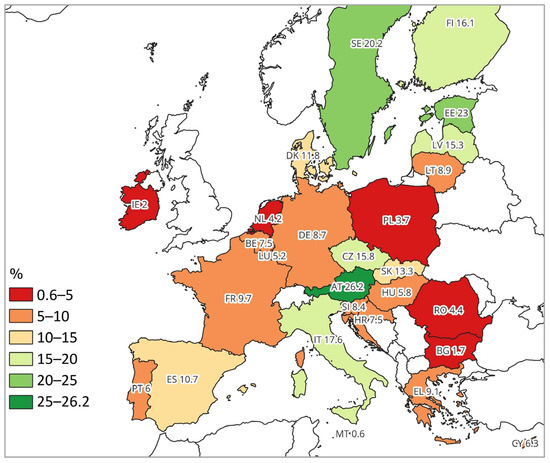 Based on the simple regression models presented in Table 2 for the years 2004–2021, the prediction of organic agriculture share in the utilized agricultural area was performed. The results are presented in Table 7. For all the EU countries, the predicted OAS was about 12.1% which was more than two times lower in comparison to the target 25% OAS in the European Commission policy. Very high differences were observed for different EU countries. The target 25% OAS is very probable to be obtained in 2030 in the following countries: Austria, Estonia, and Sweden. In these countries, the predicted OAS in 2030 was about 30% or more. The countries that will probably be near to the target OAS in 2030, i.e., in which the predicted OAS was greater than 20% are as follows: Czechia, Italy, and Latvia. The predicted OAS in 2030 in the other countries was much lower than in most of the EU countries. The lowest predicted OAS, below 5%, was found for Ireland, Netherlands, and Malta.