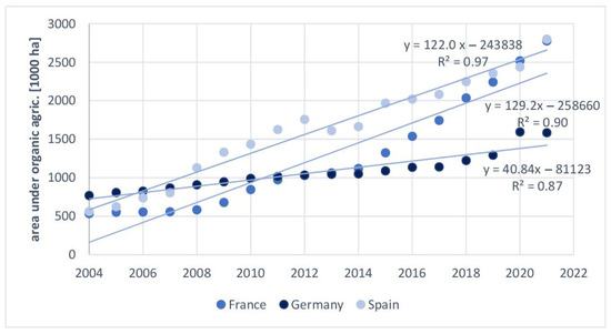 Table 2 presents linear regression equations analyzing the evolution of the area allocated to organic agriculture over time in the EU countries, along with the coefficients of determination (R2) indicating the goodness of fit of the linear regression model to the data. It should be noticed that for certain countries, strong autocorrelation was observed on the Durbin–Watson statistics for subsequent years, which may have biased the linear regression results. Particularly low values of the Durbin–Watson statistics, below 0.3, were observed for Poland, Denmark, France, and the Netherlands. The changes in organic farming area over subsequent years were challenging to describe using typical regression functions. Therefore, we opted for the simplest regression model, which was applicable to most countries and facilitated comparison based on average yearly changes (regression coefficients). Figure 2 shows the trends in the area allocated to organic agriculture over time for the three countries with the largest area dedicated to organic agriculture.
