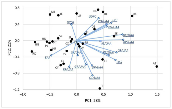 Results of PCA presenting multivariate characteristics of the EU countries and relationships between the studied variables that characterize organic agriculture and socio-economic conditions.