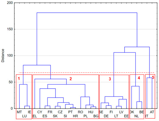Dendrogram based on cluster analysis using the 18 variables for 2021 where groups of EU countries were distinguished. Red rectangles indicate groups of countries similar according to studied variables.