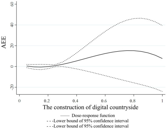 According to Figure 2, as a whole, the dynamic effect of the construction of a digital village on AEE presents a similar “inverted U-shaped” relationship. Specifically, when the construction level of a digital village belongs to the range [0.1, 0.2], there is a short negative effect. This shows that the development level of digital village construction at this stage is relatively low, influenced by the inclusion of digital village construction in the Central Document No. 1 policy issued by the Chinese government in 2018. And the application of digital technology has not fully played a role and even has a “crowding out effect”, which shows a negative effect on the whole. After crossing the threshold of 0.2, the construction of the digital village began to exert a positive impact on AEE, and the impact degree gradually deepened until it reached the inflection point of 0.8. However, when the value threshold is greater than 0.8, the marginal utility of the construction of a digital village to promote AEE begins to decline.