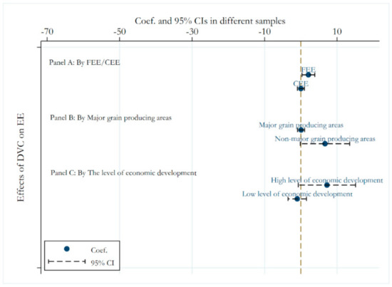 The previous analysis found that the AEE levels of food crops and cash crops have different characteristics. The former is relatively stable, while the latter fluctuates greatly under the influence of industrial development and market demand. Therefore, this characteristic difference will also be reflected in the heterogeneous effect of the construction of digital villages on the improvement of the ecological efficiency of different crop types. In Figure 3, FEE and AEE, respectively, show the results of regression between the construction of the digital village and the ecological efficiency of food crops and cash crops: the level of the construction of the digital village has a positive and significant impact on the ecological efficiency of food crops by 5%, with a coefficient of 2.0909 (FEE), while the impact coefficient on the ecological efficiency of cash crops is positive but not significant, with a coefficient of 0.0185 (CEE). The possible reasons are as follows: first, food crops are of great significance to the food security of developing countries, their planting area is extensive, and their quantity is large. Digital technology can improve the output level and environmental benefits of food crops in planting, irrigation, fertilization, disease and pest control, etc. Therefore, the positive impact of the construction of digital villages on food crops is relatively obvious. Second, compared with food crops, the production process of cash crops is more complex, has higher technical requirements, and is more sensitive to market factors. The positive effect of a digital village may be limited by market factors, technology, or production mode and cannot be fully played. Third, food is a basic survival and development need for a country and is regarded as the “lifeline” of the country. Governments usually adopt a series of support policies such as subsidies, priority resource allocation, and technical support to promote the production and development of food crops, which may also boost the application and effect of the construction of digital villages in food crop production.