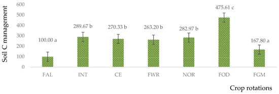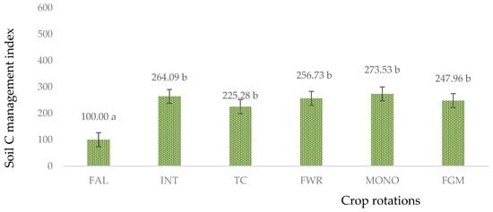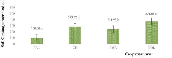 Effect of long-term soil C management index at 25 cm depth in spring barley after 52 years. FAL—continuous black fallow; INT—intensive crop rotation; CE—cereal crop rotation; FWR—field with row crop rotation; FOD—fodder crop rotation; NOR—Norfolk crop rotation; FGM—for green manure crop rotation. Different letters indicate significant differences between the treatments (a, b, c). Differences are significant (p < 0.05). The bars display a standard error.