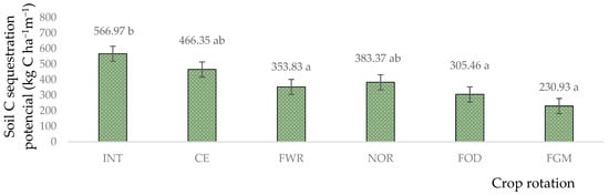 Effect of long-term soil C sequestration potential at 25 cm depth in spring barley after 52 years. INT—intensive crop rotation; CE—cereal crop rotation; FWR—field with row crop rotation; FOD—fodder crop rotation; NOR—Norfolk crop rotation; FGM—for green manure crop rotation. Different letters indicate significant differences between the treatments (a, b). Differences are significant (p < 0.05). The bars display a standard error.