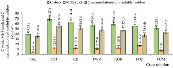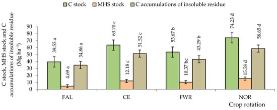 Effect of long-term soil C stock, MHS stock, and C accumulations of insoluble residue at 25 cm depth in spring barley after 52 years. FAL—continuous black fallow; INT—intensive crop rotation; CE—cereal crop rotation; FWR—field with row crop rotation; FOD—fodder crop rotation; NOR—Norfolk crop rotation; FGM—for green manure crop rotation. Different letters indicate significant differences between the treatments (a, b, c, d). Differences are significant (p < 0.05). The bars display a standard error.