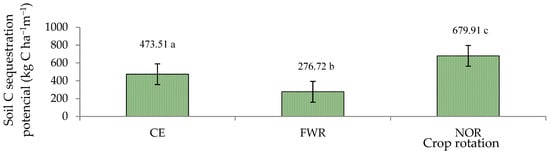 Effect of long-term soil C sequestration potential in 25 cm depth on winter wheat after 52 years. CE—cereal crop rotation; FWR—field with row crop rotation; NOR—Norfolk crop rotation. Different letters indicate significant differences between the treatments (a, b, c). Differences are significant (p < 0.05). The bars display a standard error.