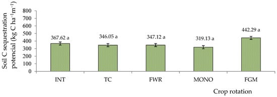 Effect of long-term soil C sequestration potential in 25 cm depth on winter wheat after 52 years. INT—intensive crop rotation; MONO—winter rye monoculture; TC—three-course crop rotation; FWR—field with row crop rotation; FGM—for green manure crop rotation. The same letters indicate no significant differences between the treatments (a). Differences are not significant (p > 0.05). The bars display a standard error.
