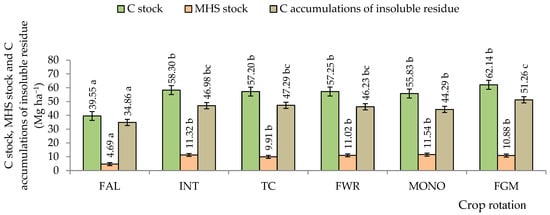 Effect of long-term soil C stock, MHS stock, and C accumulations of insoluble residue in 25 cm depth on winter rye after 52 years. FAL—continuous black fallow; INT—intensive crop rotation; MONO—winter rye monoculture; TC—three-course crop rotation; FWR—field with row crop rotation; FGM—for green manure crop rotation. Different letters indicate significant differences between the treatments (a, b, c). Differences are significant (p < 0.05). The bars display a standard error.
