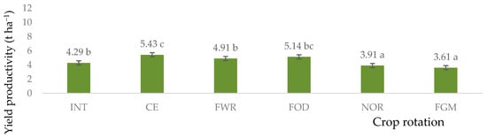 Winter wheat yield productivity was significantly higher in cereal (20.50%) crop rotation and field with row crops (17.89%) compared with Norfolk crop rotation (Figure 12).