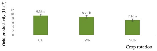 Winter wheat productivity after various pre-crops in different crop rotations in 2022. CE—cereal crop rotation; FWR—field with row crop rotation; NOR—Norfolk crop rotation. Different letters indicate significant differences between the treatments (a, b, c). Differences are significant (p < 0.05). The bars display a standard error.