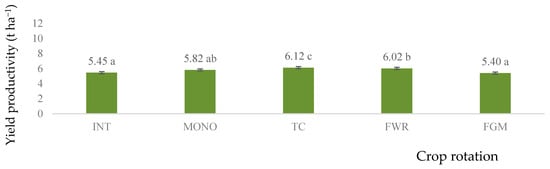Winter rye productivity after various pre-crops in different crop rotations in 2022. INT—intensive crop rotation; MONO—winter rye monoculture; TC—three-course crop rotation; FWR—field with row crop rotation; FGM—for green manure crop rotation. Different letters indicate significant differences between the treatments (a, b, c). Differences are significant (p < 0.05). The bars display a standard error.